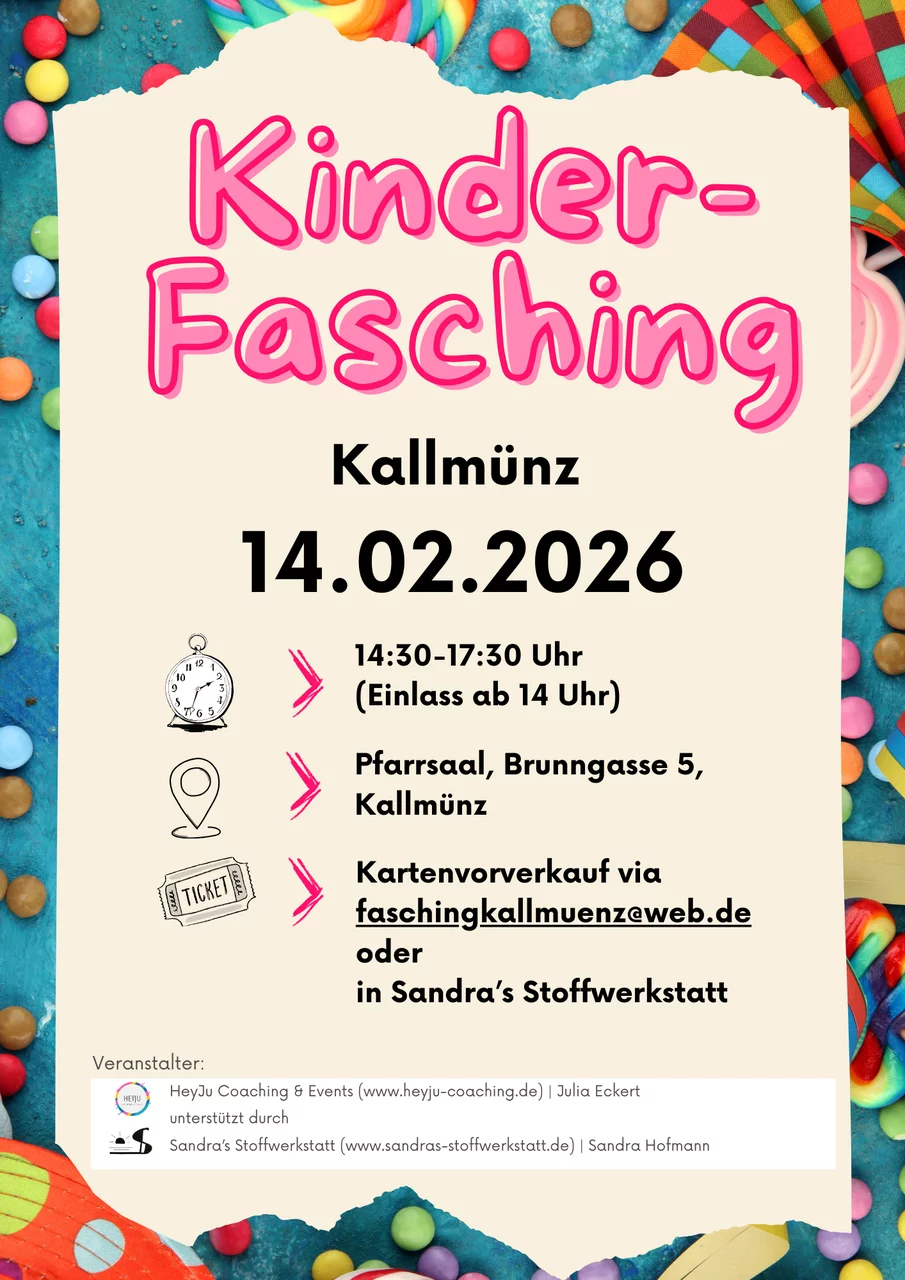 Karten für den Kinderfasching Kallmünz 2026 könnt Ihr im Vorverkauf bei mir im Laden Sandra's StoffWerkstatt kaufen. Auf dem Plakat oben stehen alle wichtigen Informationen zum Kinderfasching in Kallmünz.