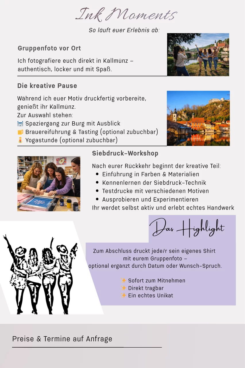 Mit INK MOMENTS biete ich dir einen kreativen Siebdruck-Workshop in Kallmünz (Oberpfalz) – perfekt für Gruppen, die gemeinsam etwas Persönliches gestalten möchten.